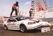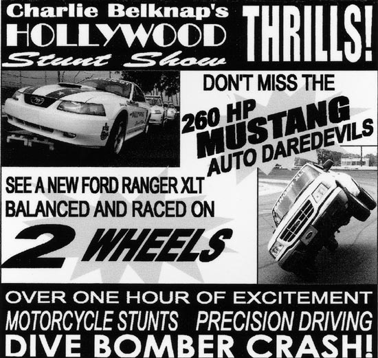 Charlie Belknap’s Hollywood Stunt Show once again showcases a fleet of current model Ford cars and trucks in a 70 minute, hihg-energy spectacle of speed and sound for their 15th annual 2004 tour.